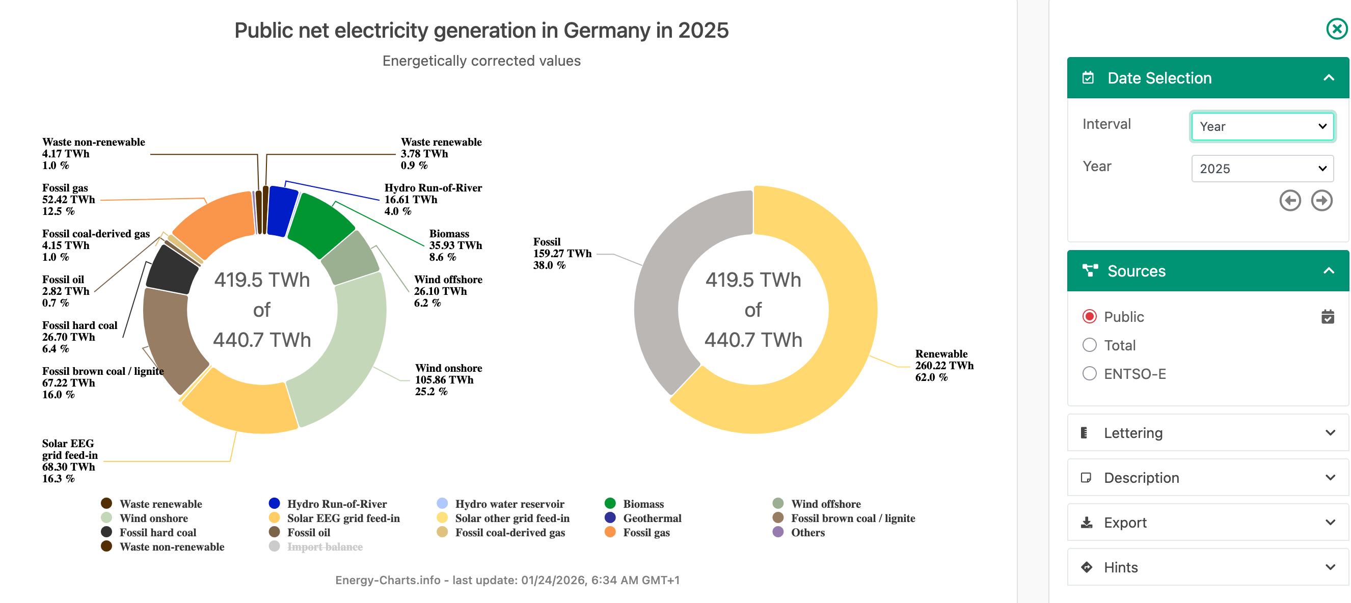 In 2024, renewables accounted for a record 63% of the public electricity mix. In 2025, the share has remained at a similarly high level: wind, solar, and other renewable sources generated 62% of the electricity fed into the public grid.